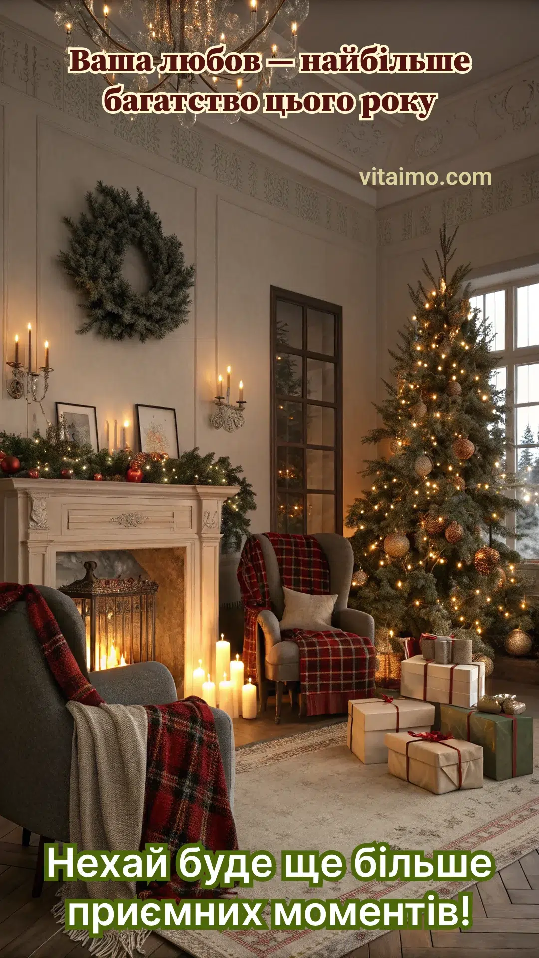 Тепла новорічна листівка з каміном, ялинкою та подарунками