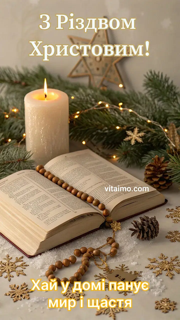 Різдвяне християнське привітання з Біблією, свічкою та побажанням миру в оселі