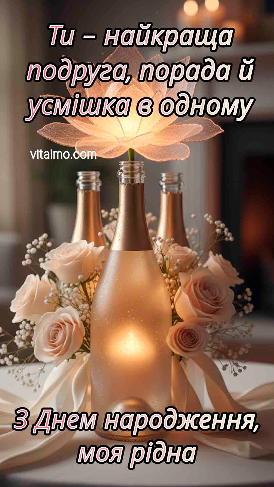 Ніжне привітання з Днем народження для рідної подруги, яка поєднує в собі і підтримку, і мудру пораду, і щиру усмішку. Тепле сяйво всередині пляшки серед кремових троянд нагадує про світло дружби, яке зігріває навіть у найпохмуріші моменти. Така листівка з Днем народження доречна, коли хочеться сказати подрузі, що вона більше, ніж просто близька людина, – справжня рідна душа. Її можна надіслати в особливий ранковий меседж, додати до подарунка або прикріпити до привітання в соцмережах. Це привітання тонко передає вдячність, любов і бажання, щоб у її житті завжди було достатньо тепла, радості й натхнення.