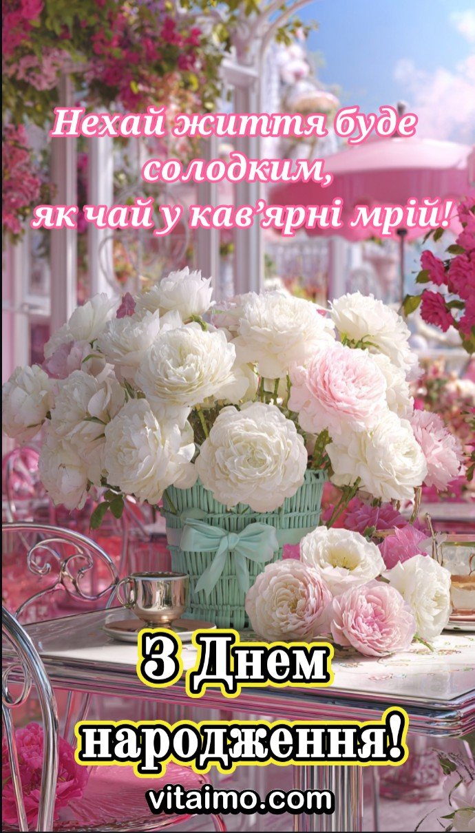 Це привітання створене для справжньої поціновувачки ніжності, краси й солодких моментів у житті. Букет півоній символізує вишуканість, жіночність та бажання добра, а атмосфера кав’ярні додає тепла й легкого романтичного настрою. Така листівка ідеально підійде для дівчини або подруги, щоб зробити її день народження ще яскравішим. Вона м’яко нагадує, що життя може бути солодким, коли в ньому є любов, мрії й чарівні миті. Це маленький знак уваги, який подарує усмішку і трішки святкового настрою — з першої секунди отримання. А тут привітання для невістки.