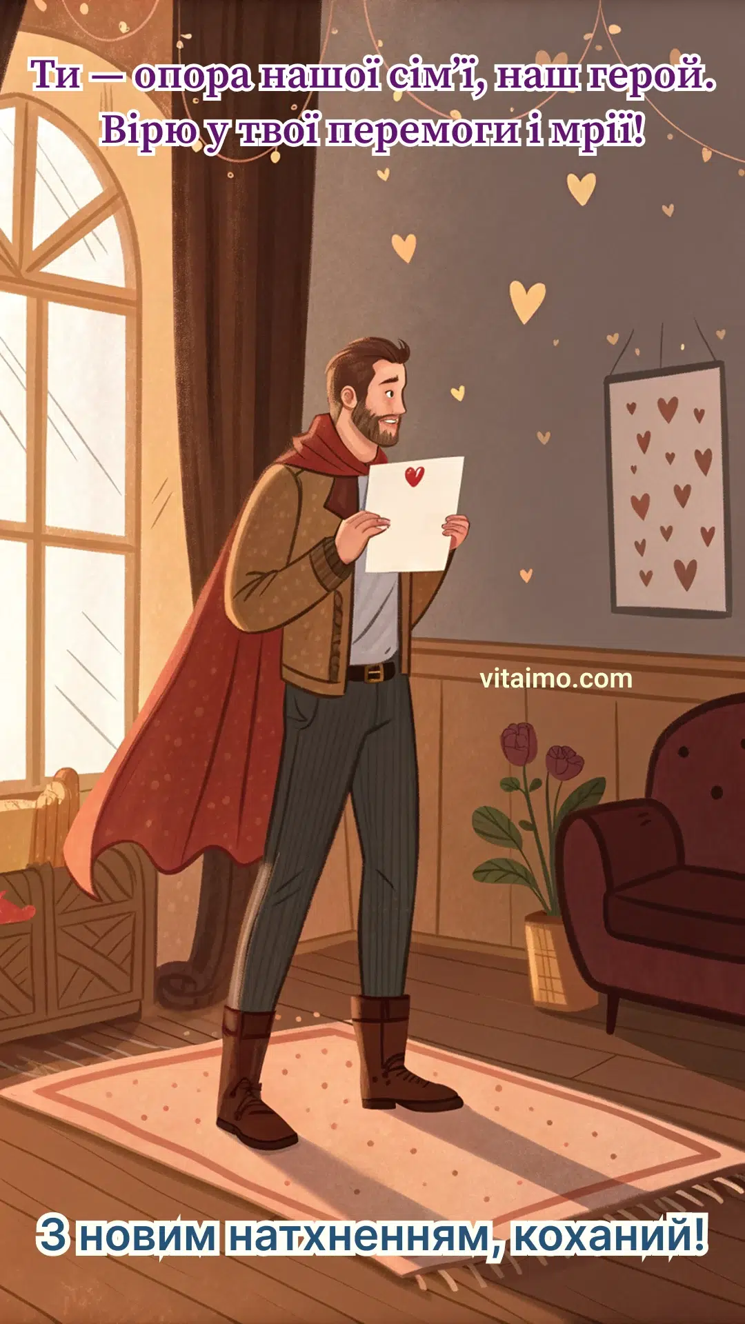 Ця святкова листівка — щира подяка чоловікові, який завжди поруч, підтримує, надихає й робить сім’ю міцною. Вона передає теплі слова любові та віри в його сили, досягнення і майбутні перемоги. Новий рік — чудова нагода нагадати, що він справді герой у вашому житті. Нехай посмішка, добро і кохання завжди супроводжують ваші спільні кроки вперед. Така листівка стане чудовим подарунком і теплим жестом уваги.