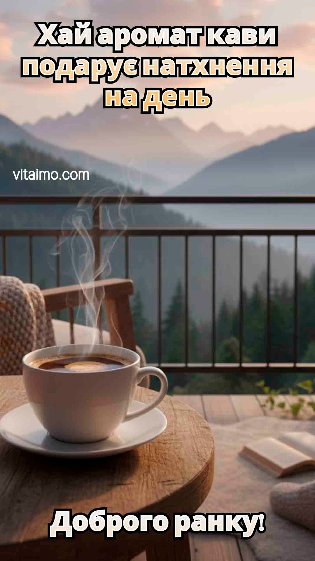 Яскраве побажання з новими горизонтами та свіжим диханням ранку. Така листівка ідеально підійде, щоб нагадати дорогим людям про красу нового дня й можливості, які він приносить. Вид на гори передає спокій і силу, а гаряча кава — відчуття тепла і приємного старту. Це привітання буде доречним для друга, коханої людини чи колеги, щоб зарядити позитивом і натхненням. Воно допоможе сказати: «Нехай цей день відкриє тобі щось хороше». Іноді одна картинка та кілька добрих слів здатні зробити ранок кращим.
