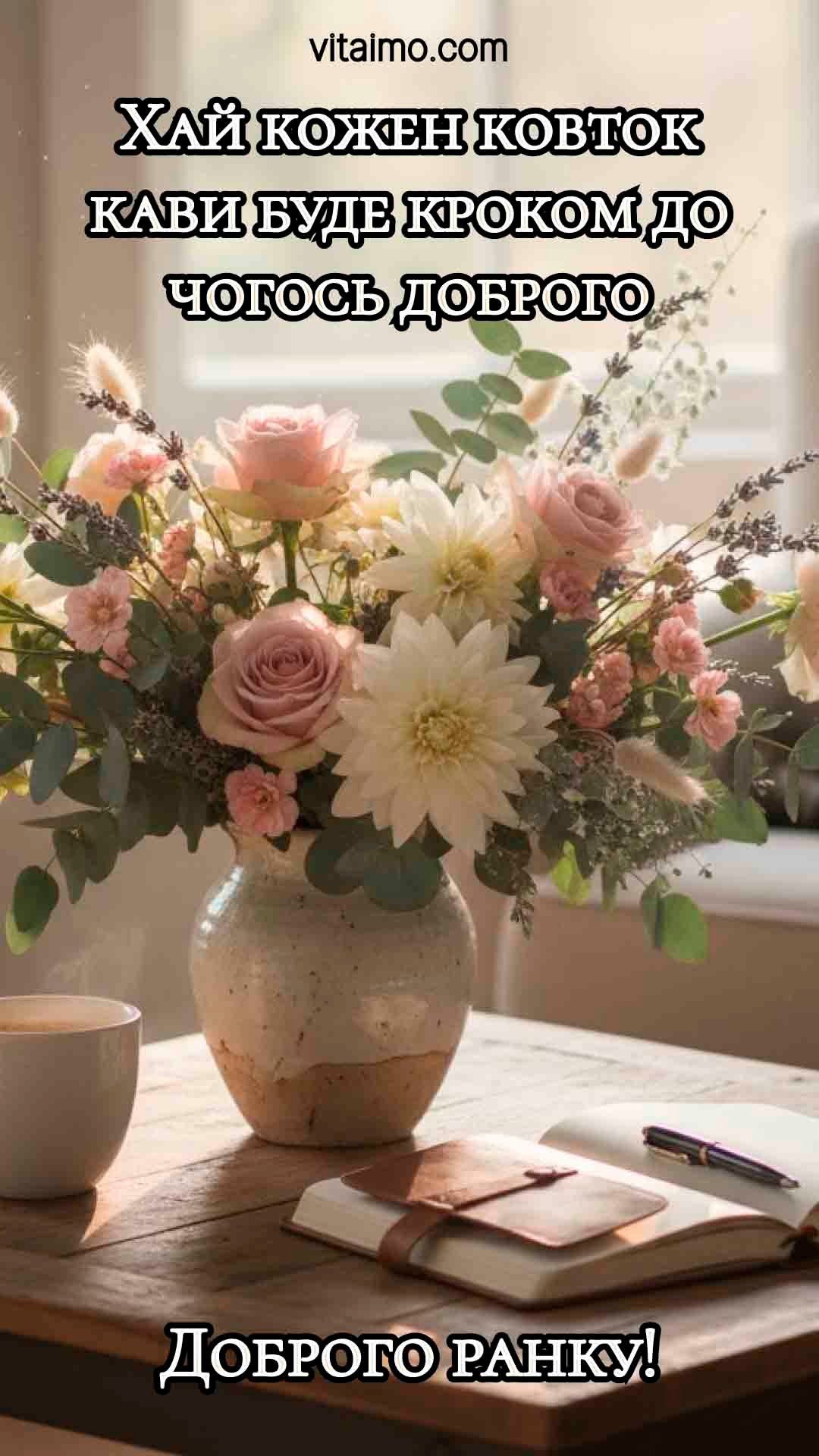 Побажання доброго ранку з квітами, турботою і ароматом кави