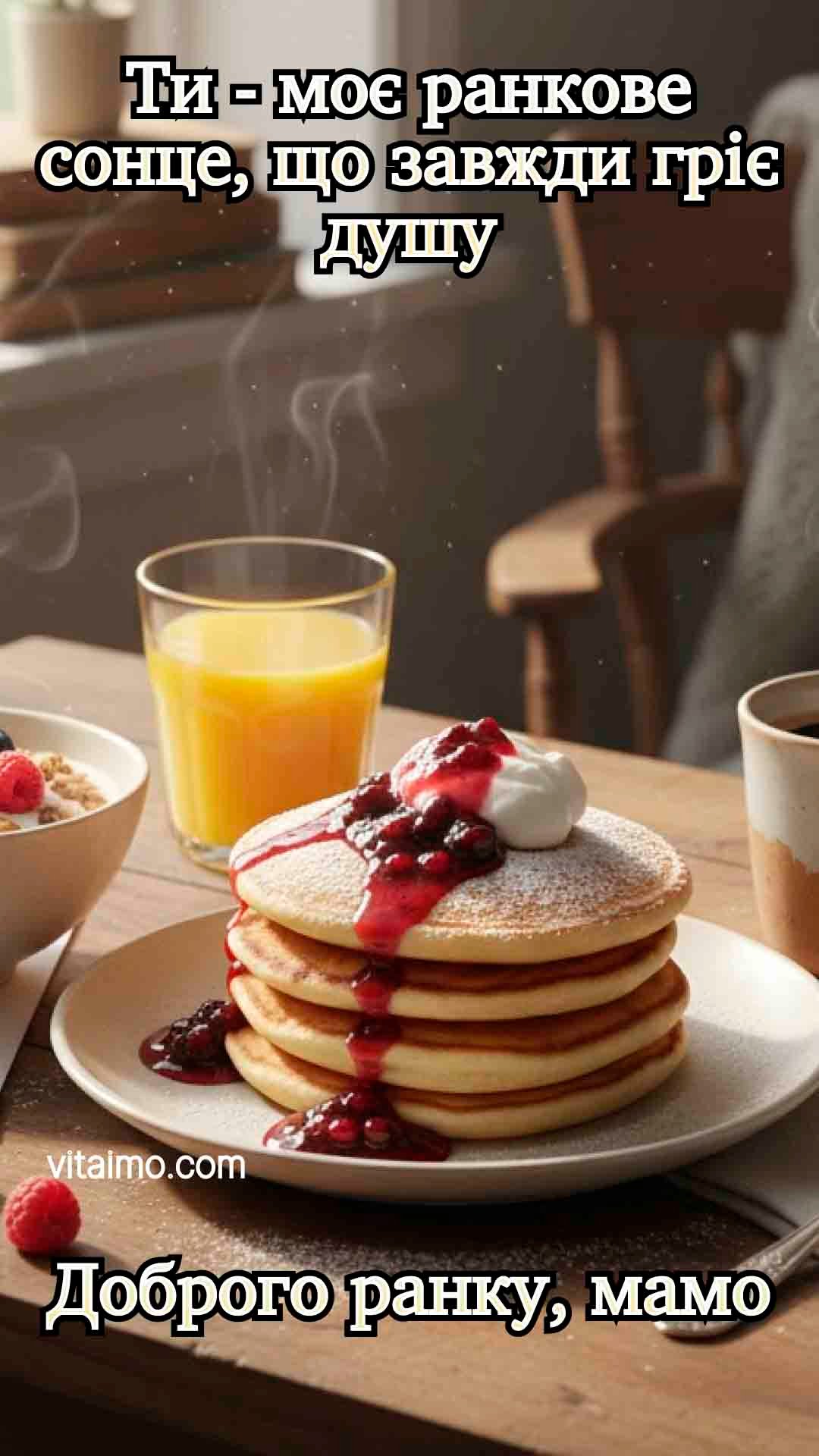 Ніжне ранкове привітання для мами поєднує у собі тепло рідної кухні й апетитний сніданок із пухких млинців, ягід, соку та ароматної кави. Така листівка доброго ранку, мамо, ніби запрошує почати день повільно й смачно, з усмішкою і відчуттям турботи. Вона пасує для тих моментів, коли хочеться сказати мамі, що саме вона є твоїм ранковим сонцем, яке зігріває душу, навіть якщо ви не поруч. Це привітання можна надіслати в будній день, на вихідних або як доповнення до сюрпризу в ліжко зі справжнім сніданком. Листівка м’яко передає вдячність за любов і побажання легкого, світлого й смачного початку дня.