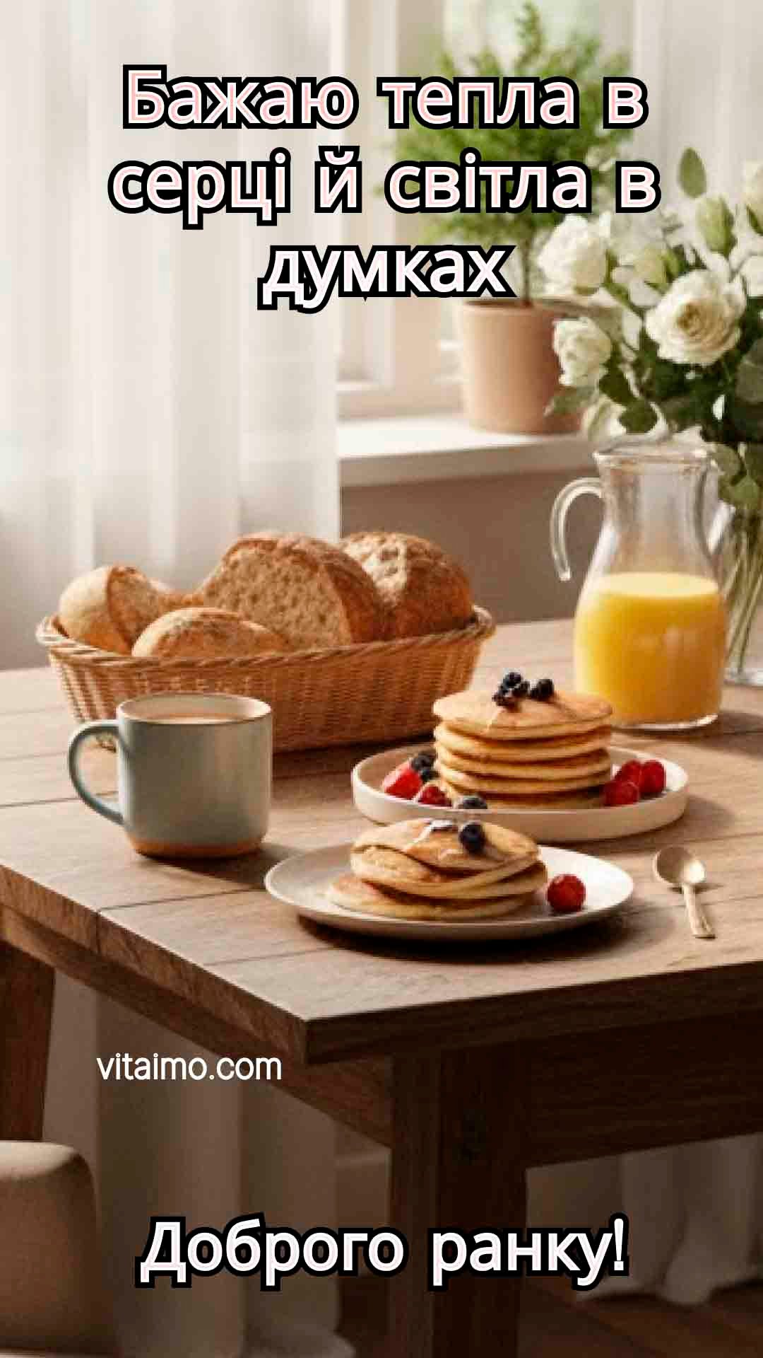 Ніжне побажання чудового ранку, яке створює атмосферу затишку та приємного початку дня. Така листівка стане прекрасним сигналом турботи: її можна надіслати близьким, колезі або для романтичної уваги. Смачний сніданок і м’яке сонячне світло передають спокій, доброту та гарний настрій. Вона ніби нагадує: день тільки починається, і в ньому є місце для чогось приємного. Додайте кілька теплих слів, і це привітання подарує посмішку з самого ранку. Підійде для будь-якого дня, коли хочеться підтримати, порадувати чи просто нагадати, що хтось важливий. Або навіть надіслати колезі як привітання з Днем логіста.