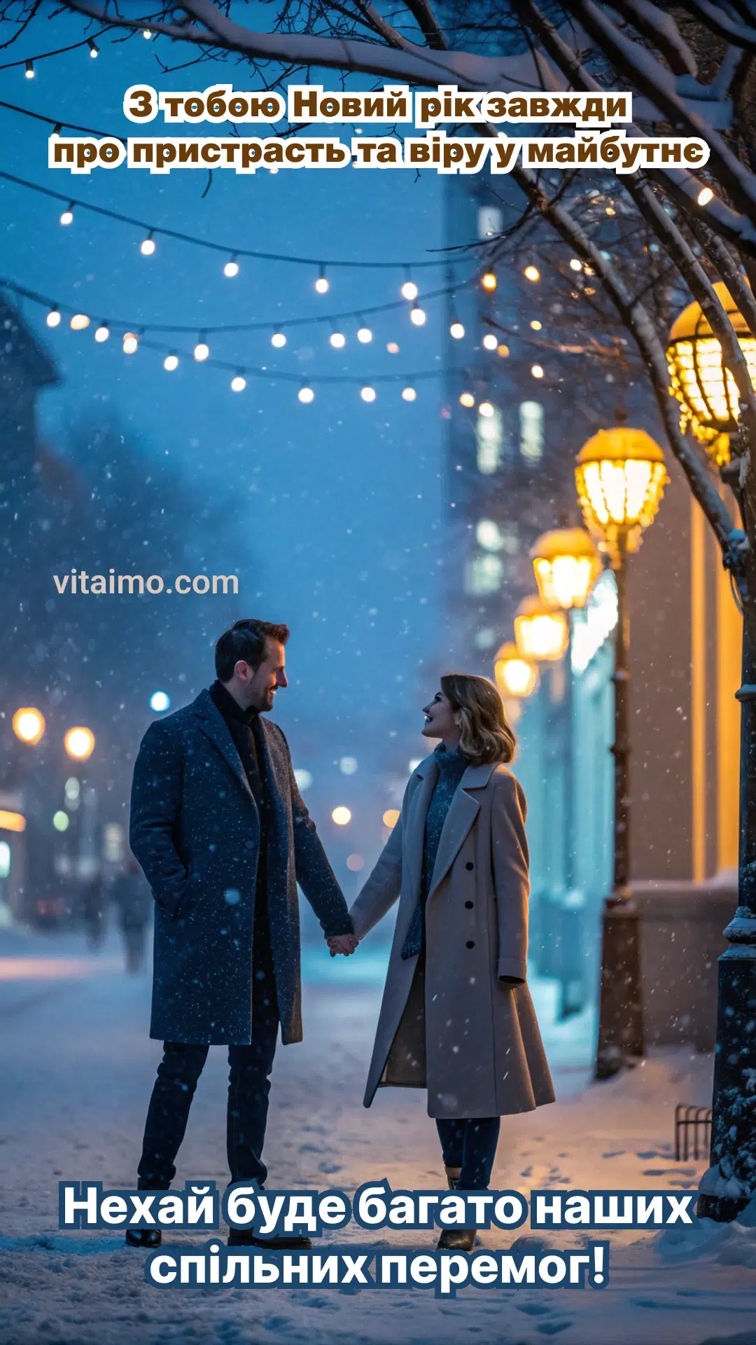 Ця листівка наповнена святковими емоціями, які здатні зігріти навіть найхолоднішу ніч. Коли ви удвох — усе навколо світиться сильніше, а мрії здаються ближчими. Міські вогні, обійми та новорічна магія створюють ідеальний настрій для побажань коханому чоловікові. Таке привітання скаже йому, що саме з ним Новий рік — справжнє свято, що ви вдячні за його любов і присутність у вашому житті. Побажайте йому радості, успіхів і неймовірних відчуттів — адже найкращі миті народжуються поруч із тим, кого любиш.