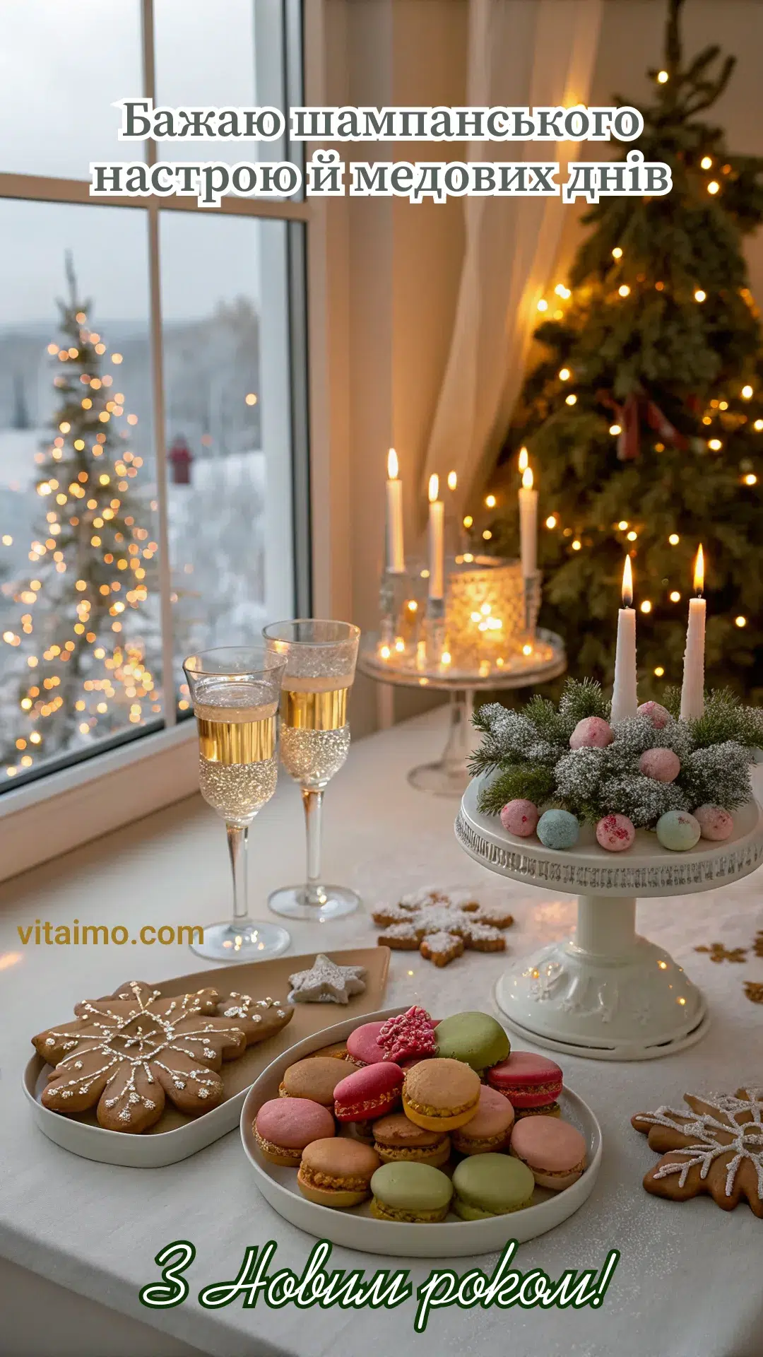 Яскраве новорічне привітання для тих, хто хоче увійти в новий рік із шампанським настроєм і солодкими планами. На святковому столі мерехтять свічки, поруч стоять елегантні келихи ігристого, тарілки з макаронами й пряниками, а у вікні видно засніжений пейзаж і сяючу ялинку. Така новорічна листівка створює відчуття затишного вечора, коли можна підняти келих за нові мрії та розділити десерти з близькими. Це привітання З Новим роком підійде для друзів, колег чи пари що відзначає річницю весілля, або люблять красиві традиції, спільні тости й теплі зустрічі. Надішліть цю листівку, щоб побажати медових днів, яскравих свят і солодких моментів у кожному новому ранку року.