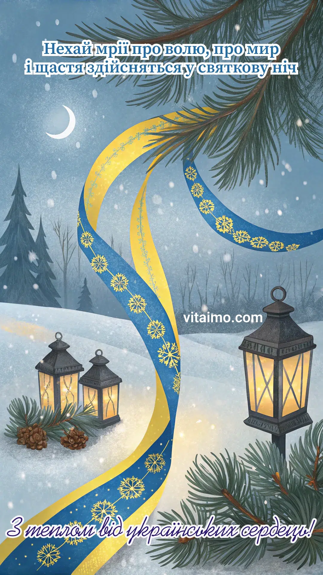 Ця новорічна листівка наповнена святковим сяйвом і символічними кольорами нашої країни. Синьо-жовті стрічки, мов оберіг, нагадують про мрії українців: жити в мирній, вільній і щасливій Україні. М’яке світло ліхтарів створює атмосферу затишку й віри у здійснення найпотаємніших бажань у святкову ніч. Таке привітання чудово підійде друзям, рідним або колегам, щоб передати підтримку, тепло та оптимізм у Новому році. Надсилаючи цю листівку, ви бажаєте тим, кого любите, світлого майбутнього, радості та безмежної віри в перемогу. Листівка українською мовою, наповнена патріотичним змістом і новорічною магією.