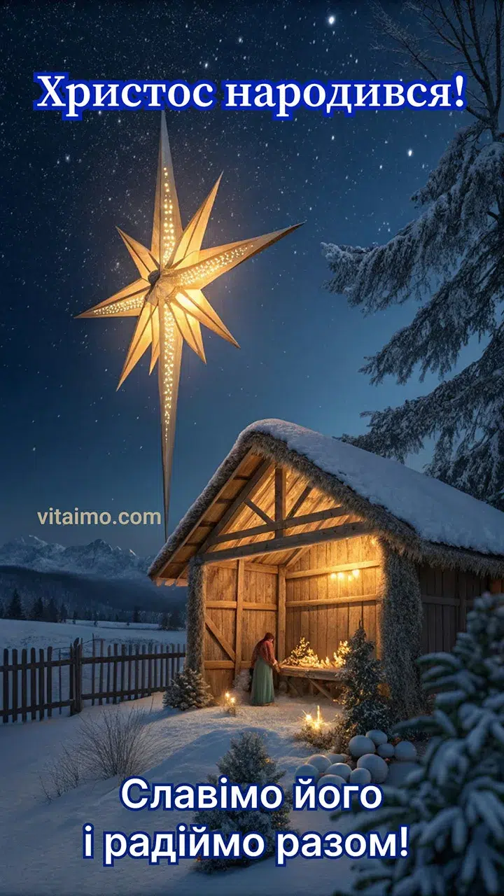 Привітальна листівка до Різдва зображує тиху зимову ніч, у якій вся увага зосереджена на невеличкій дерев’яній шопці з немовлям Ісусом. Тепле світло в яслах контрастує з холодним снігом навколо й створює відчуття затишку, миру та Божої присутності. Висока різдвяна зірка над шопкою нагадує про диво народження Христа й запрошує зупинитися серед буденної метушні. Таке різдвяне привітання доречно надіслати батькам, хрещеним, друзям чи церковній спільноті, коли хочеться побажати світла у серці й єдності в родині. Листівка до Різдва передає вдячність за спасительний прихід Ісуса та надихає прославити Його разом, навіть якщо ви далеко одне від одного.