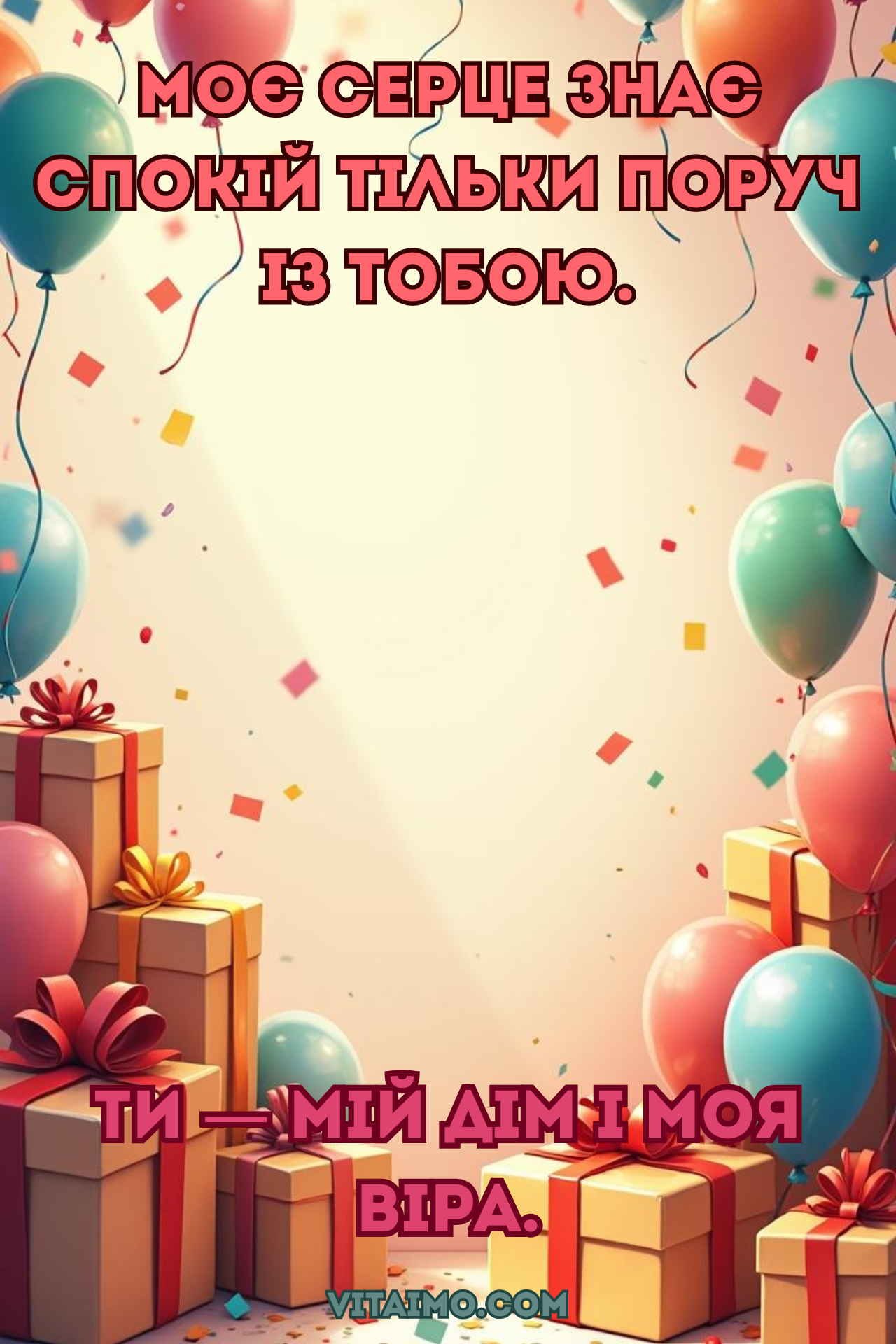 Привітальна листівка для коханої жінки, у якій зібрано весь настрій домашнього свята з кулями, подарунками та розсипом конфетті. Вона передає відчуття безпеки й спокою поруч із дорогою людиною, яка є твоїм домом і опорою. Таке привітання доречно надіслати до Дня народження, річниці, спільного свята чи просто тоді, коли хочеться подякувати їй за підтримку. Листівка допоможе м’яко сказати, що твоя віра й сила народжуються саме з її присутності. Додай кілька теплих слів у повідомленні, і це привітання стане ще одним доказом того, наскільки вона для тебе важлива.