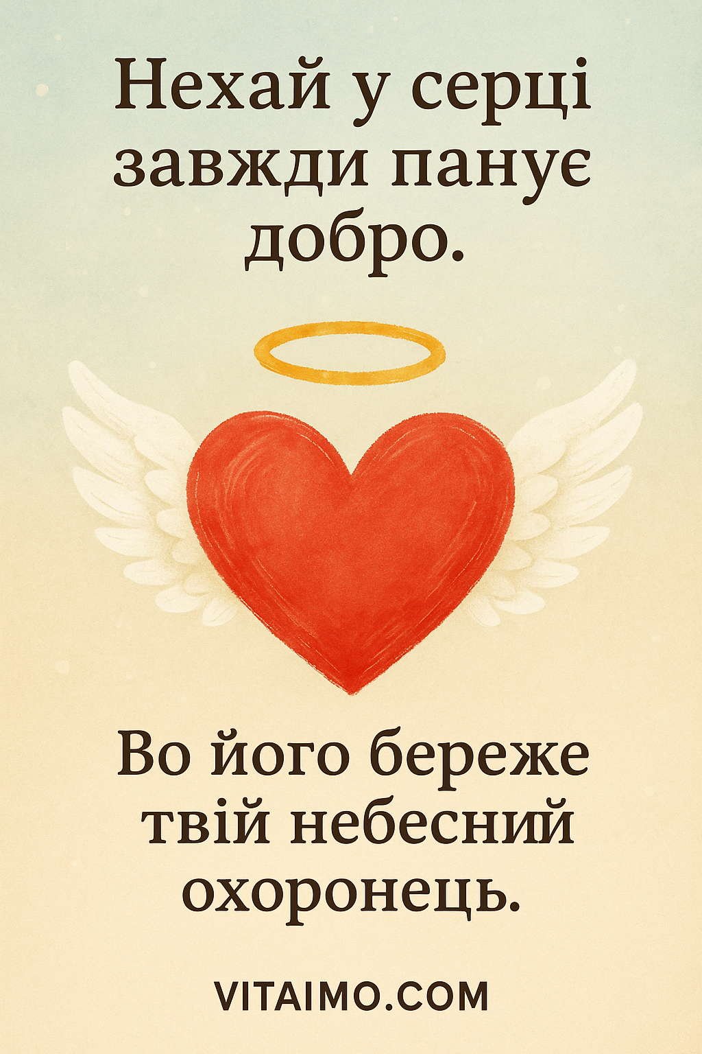 Ніжне духовне привітання до Дня ангела, де червоне серце з білими крилами й німбом символізує поєднання любові, доброти та небесного захисту. Ця листівка ніби нагадує, що коли душа відкрита до добра, ангел‑охоронець завжди тримає її під своєю опікою. Її можна надіслати рідним, друзям, дитині чи хрещенику, щоб побажати чистих думок, світлого шляху й Божої благодаті на кожен день. Листівка створює спокійний, теплий настрій і м’яко підтримує віру в те, що поруч є небесний захисник. Додай до неї кілька особистих слів, і це привітання стане важливим знаком уваги для дорогої людини.