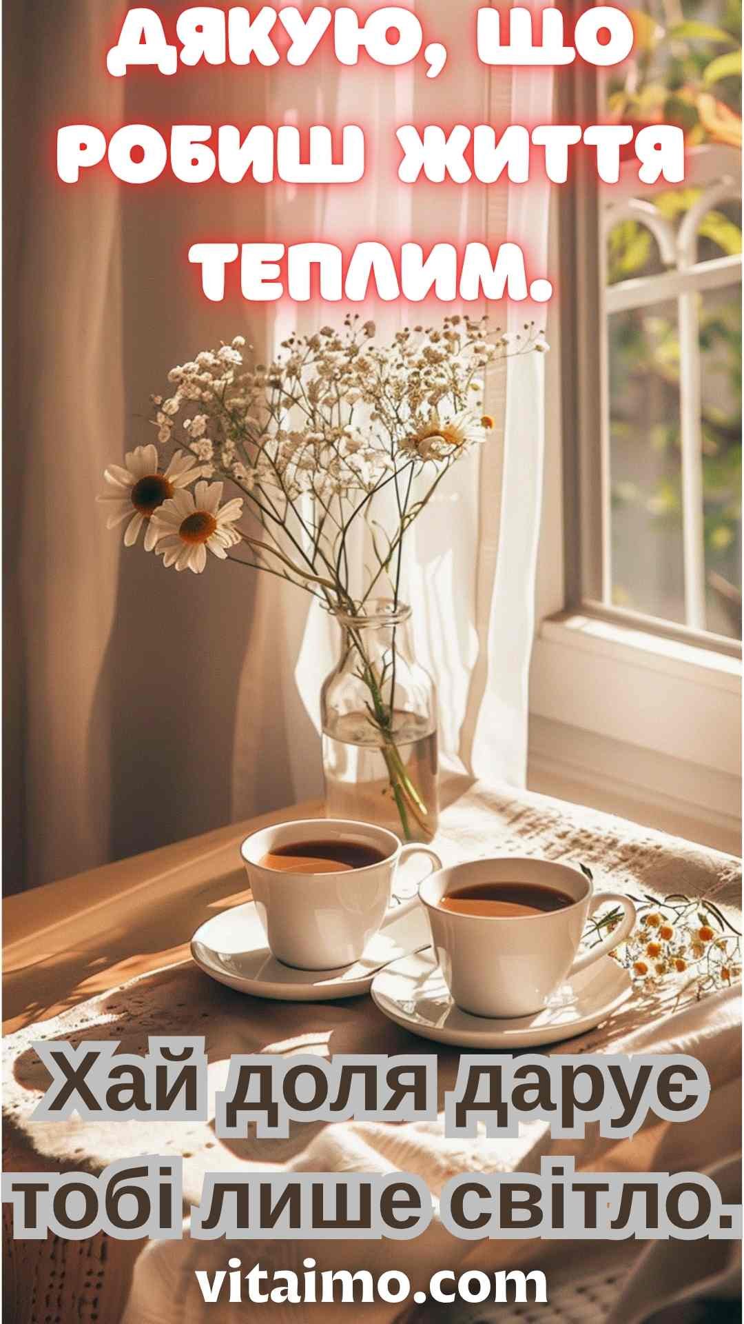 Це привітання створене для особливої жінки, яка робить кожен день теплішим і радіснішим. Воно передає моменти затишку, коли поруч є любов і турбота, коли навіть проста кава разом стає чимось важливим. Така листівка допоможе сказати «дякую» за тепло, яке вона дарує, та побажати, щоб доля відповідала їй тим самим світлом. Її можна подарувати коханій у ранковий час або надіслати в месенджері, щоб нагадати: сьогодні її день, і вона заслуговує найкращого. Листівка чудово доповнить подарунок і стане щирим жестом уваги.