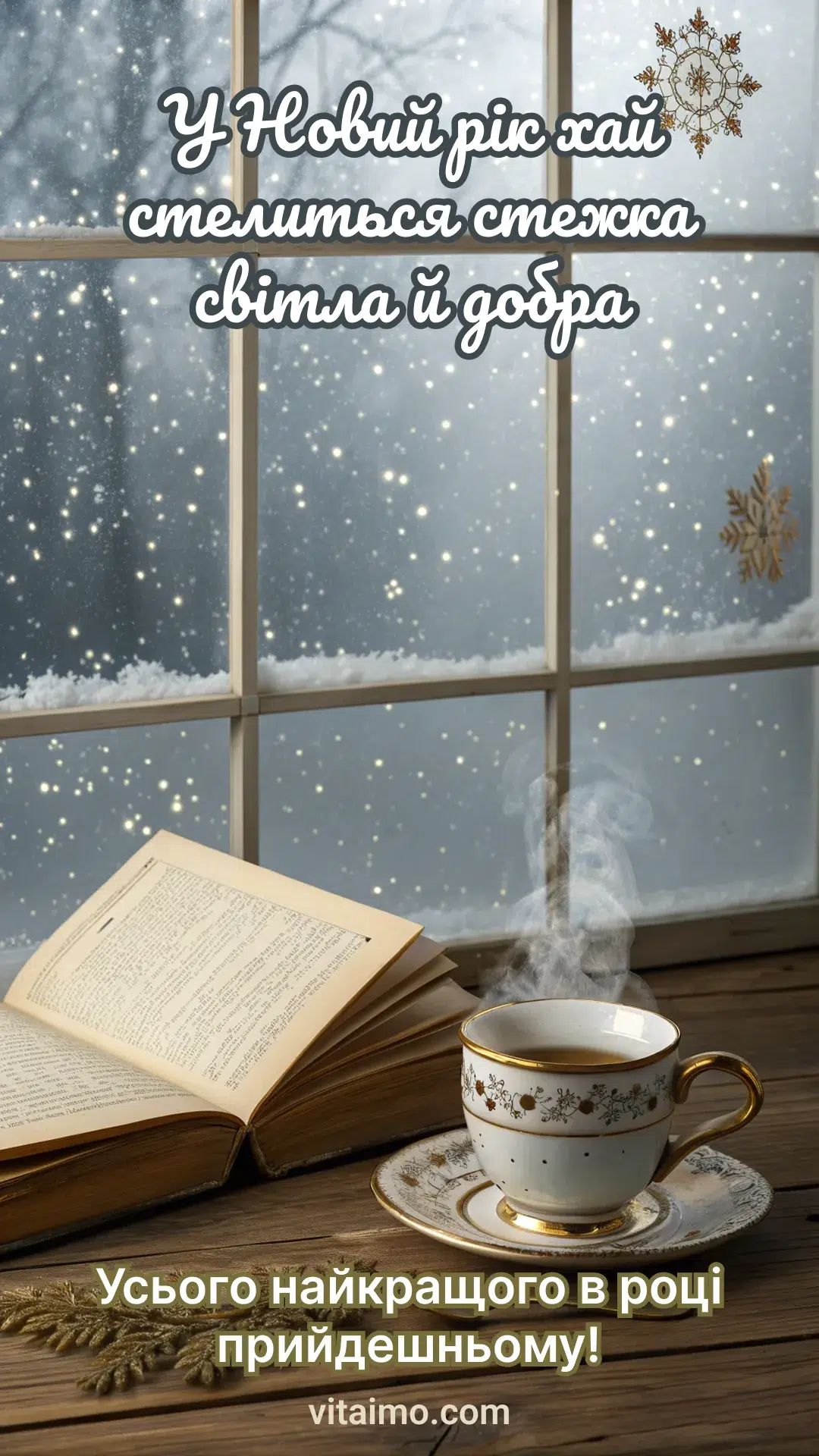 Ця листівка випромінює особливий затишок зимових свят. Тепла чашка чаю, улюблена книга й засніжене вікно створюють атмосферу спокою, коли хочеться побути поруч з дорогими людьми — навіть якщо вони далеко. Листівка українською передає щире побажання світлих подій і радості в новому році. Вона чудово підійде для привітань друзів, родини, колег або тих, кого ви хочете огорнути теплом і увагою. Надішліть таку листівку, щоб подарувати гарний настрій, віру в добро та мрії, які обов’язково здійсняться. Нехай новий рік наповнить серце спокоєм, успіхом і приємними митями щастя.