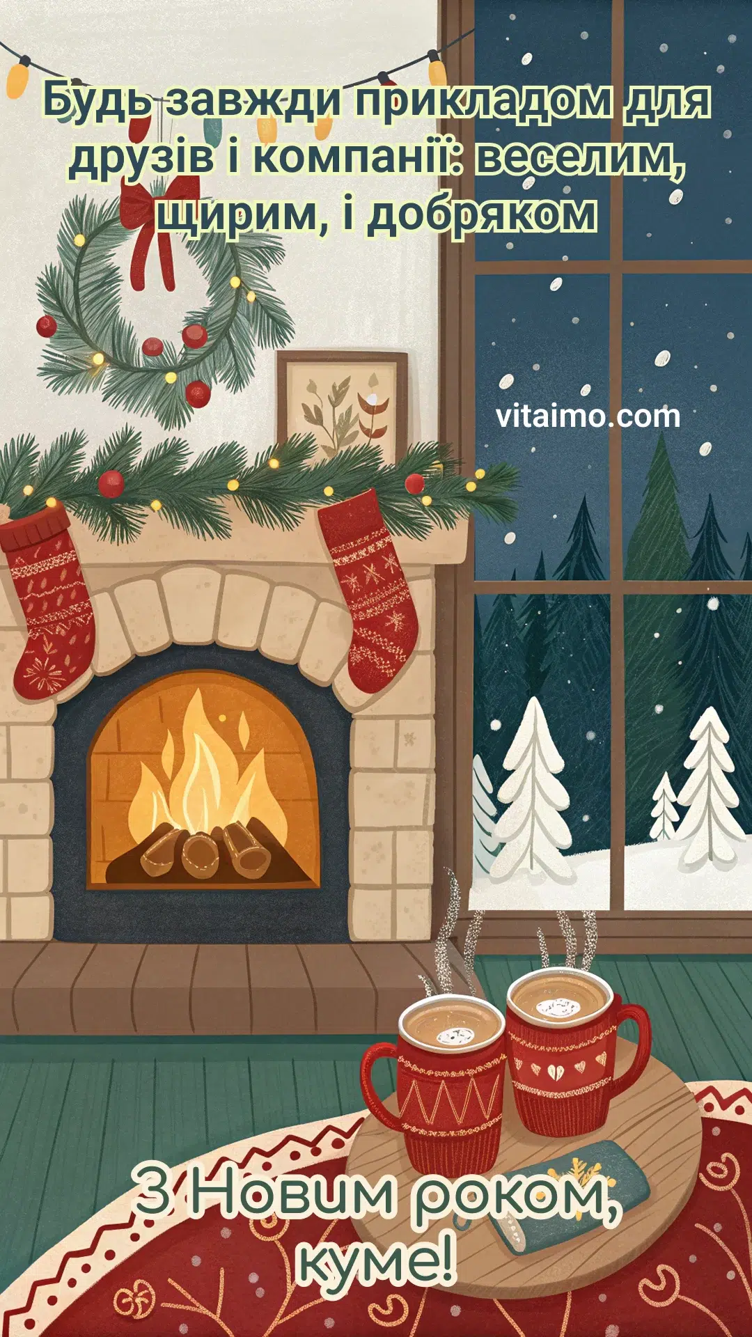 Привітальна новорічна листівка для кума, у якій поєдналися домашній затишок каміна, зимова казка за вікном і дві чашки гарячого напою на круглому столику. Таке привітання підійде для близького кума, з яким хочеться поділитися теплом, подякувати за підтримку й побажати ще більше приємних зустрічей у новому році. Листівка З Новим роком створює атмосферу дружньої компанії, коли можна зібратися ввечері, поговорити й посміятися. Надішли це привітання куму в месенджері чи листом, додай кілька своїх слів — і воно стане маленьким новорічним ритуалом, який буде приємно згадувати. Така листівка підкреслює щирість стосунків і бажання залишатися поруч у будь-яку пору року.