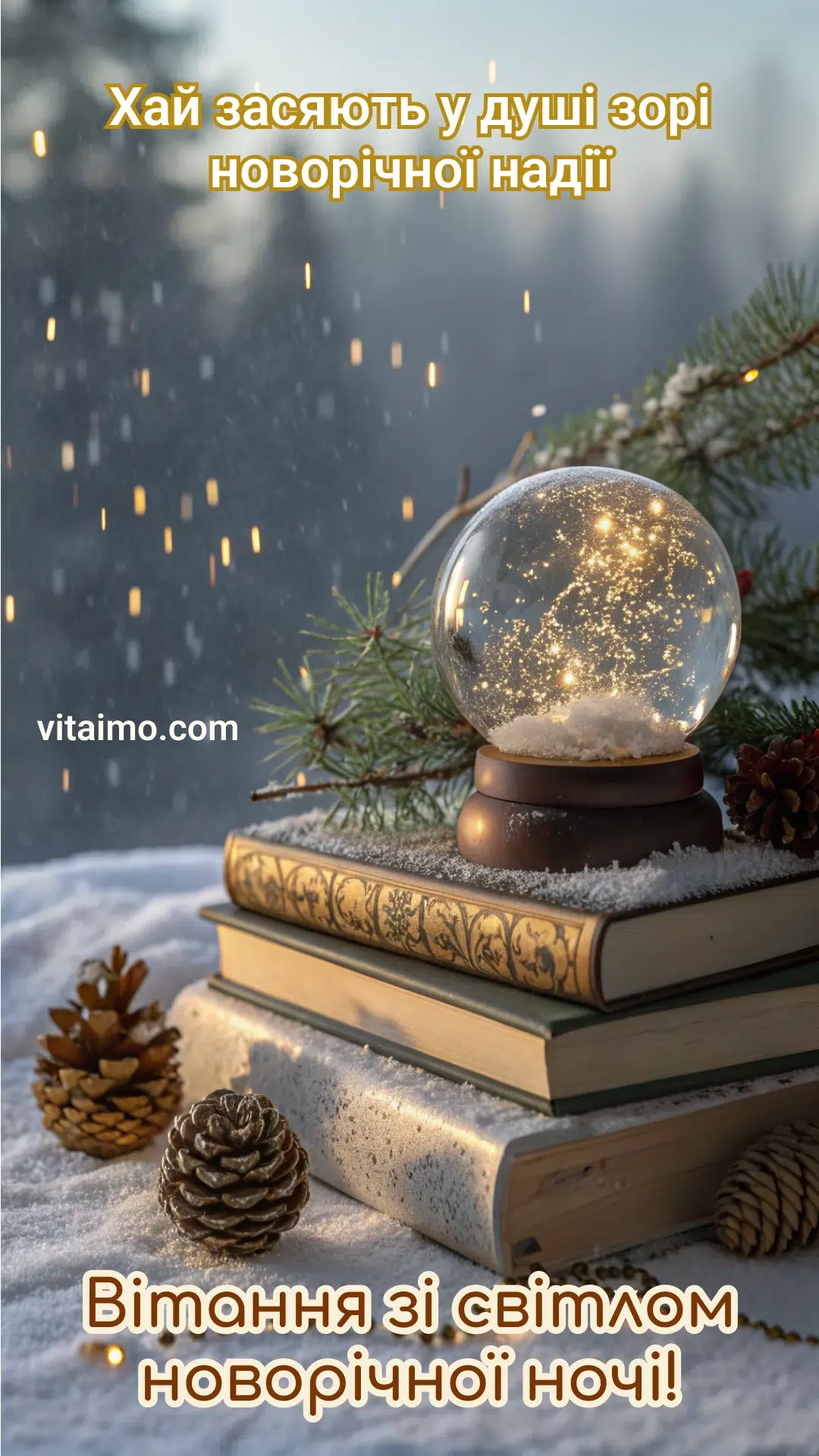 Ця новорічна листівка передає справжню магію — коли навколо тихо кружляє сніг, вогники сяють у темряві, а всередині серця з’являється яскраве світло надії. Снігова куля, що світиться, та старовинні книги створюють атмосферу казкового очікування — попереду новий розділ і нові чудові події. Українське побажання світла й радості робить цю листівку чудовим привітанням для близьких, колег чи друзів. Надішліть її, щоб подарувати віру в диво, хороші новини та теплі моменти, які ніколи не забуваються. Нехай у новому році збудеться все, що приносить щастя!