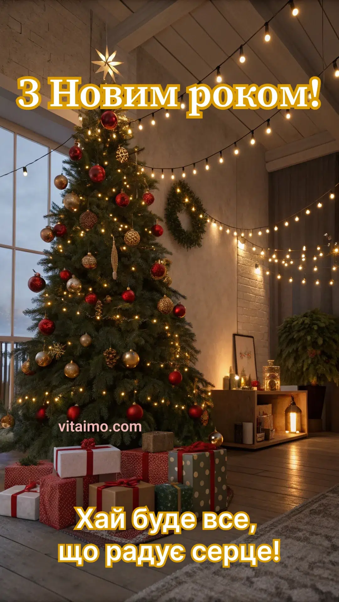 Це новорічне привітання занурює в атмосферу домашнього затишку: у просторій вітальні сяє висока ялинка, прикрашена золотими й червоними кулями, а по стінах тягнуться теплі гірлянди вогників. Під деревом акуратно розкладені подарунки в яскравому папері, які чекають, коли родина збереться разом, щоб розгорнути їх у святковий вечір. Така листівка З Новим роком доречна для друзів, колег і близьких, яким хочеться побажати не лише успіхів, а й простих людських радощів: тепла дому, сімейних зустрічей, сміху й приємних сюрпризів. Вона нагадує, що справжнє свято — це коли поруч люди, з якими затишно навіть у найзвичайніший зимовий день. Надішли цю листівку з кількома щирими словами — і вона стане приємним акцентом у новорічних привітаннях.