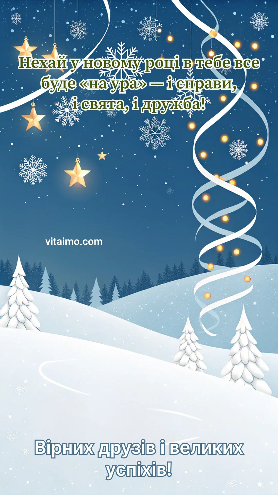 Ніжна новорічна листівка з казковим зимовим пейзажем: м’які снігові пагорби, стрункі хвойні дерева та глибоке синє небо, засіяне зірками, сніжинками й вогниками на декоративній стрічці. Це привітання ніби говорить, що в новому році все має вдаватися легко й радісно: і робочі справи, і свята, і дружні зустрічі. Листівка підходить для друга, колеги або близької людини, якій хочеться побажати вірних людей поруч, натхнення та впевнених кроків до успіху. Надішли її в месенджері чи листом, додавши кілька теплих слів — і це новорічне привітання стане маленькою зіркою підтримки на початку року.