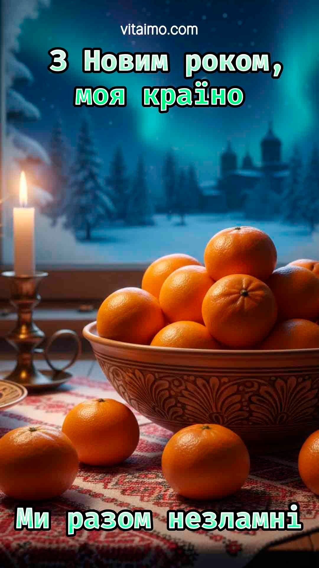 Новорічне привітання Україні з мандаринами, свічкою та зимовою ніччю