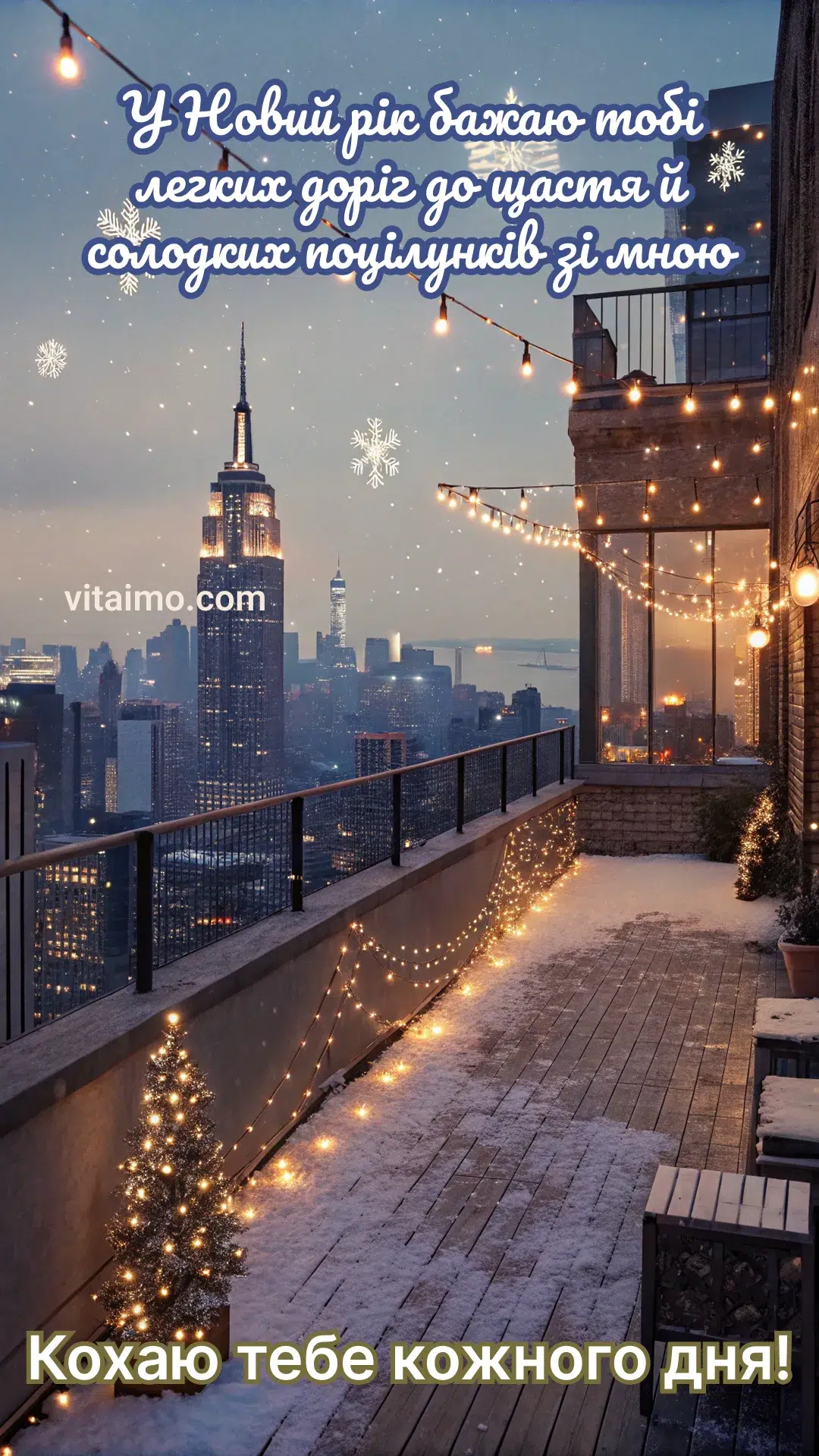Новорічне привітання для коханої з романтичною терасою та нічним містом