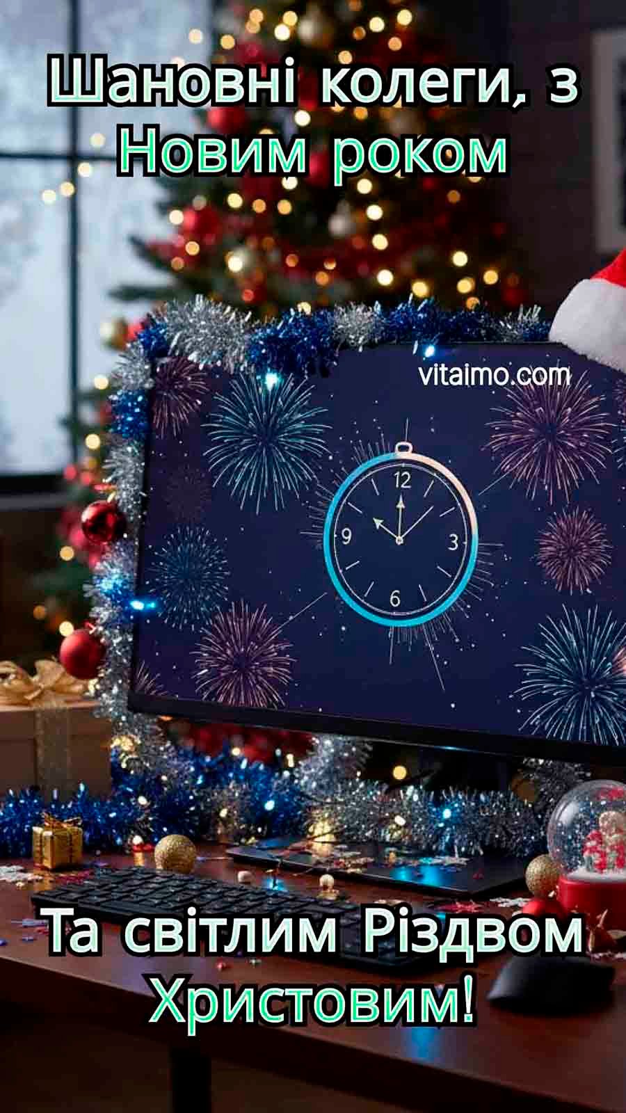 Новорічно-різдвяне привітання для колег з комп’ютером та ялинкою